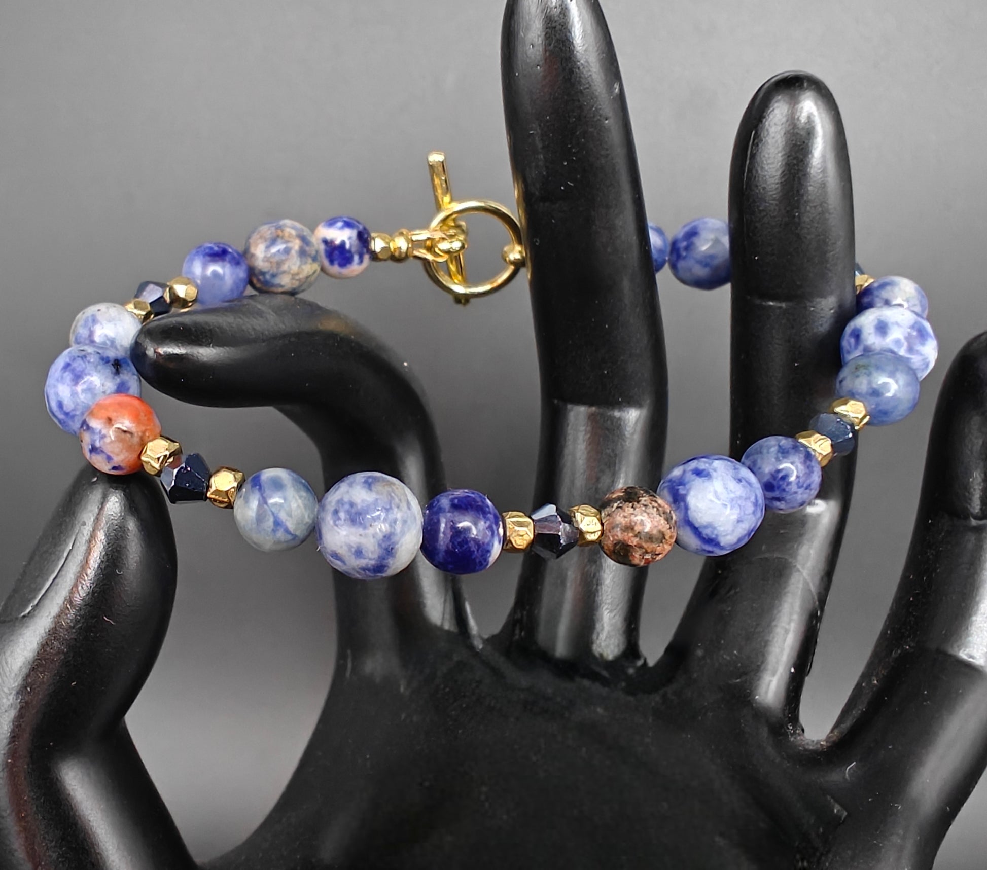 Hand-beaded bracelet made with genuine Sodalite beads (6mm & 8mm) in shades of blue, tiny gold-plated Hematite spacer beads, and iridescent navy blue bicone beads and a gold-tone toggle clasp.