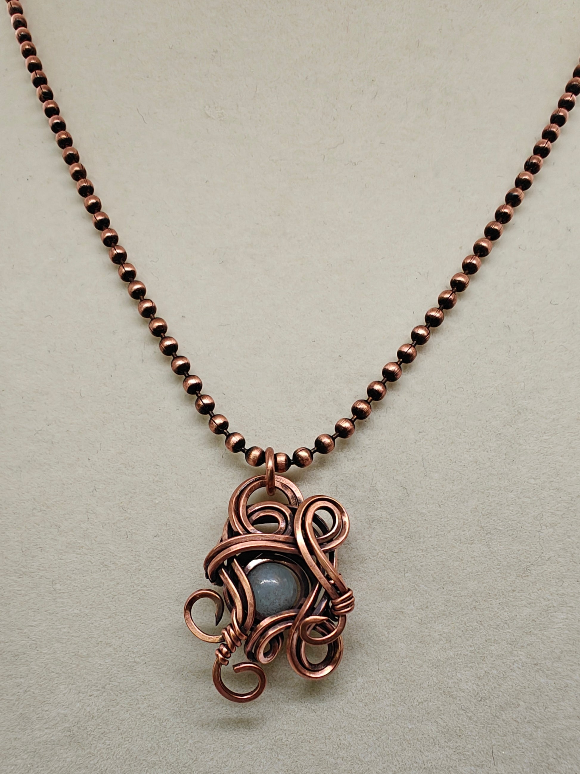 Handmade pendant that features a genuine pale blue Aquamarine bead (6mm) surrounded with swirls of antique copper wire. Includes a 15" antique copper ball chain.