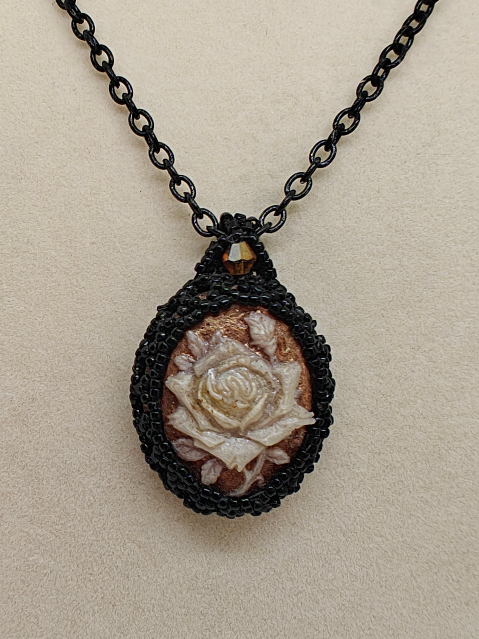 This Rose Flower Cameo pendant has a hand beaded lace-like bezel made of tiny glossy black beads with an iridescent rust colored bicone accent bead at the bail. Includes an 18 inch matching black metal chain.