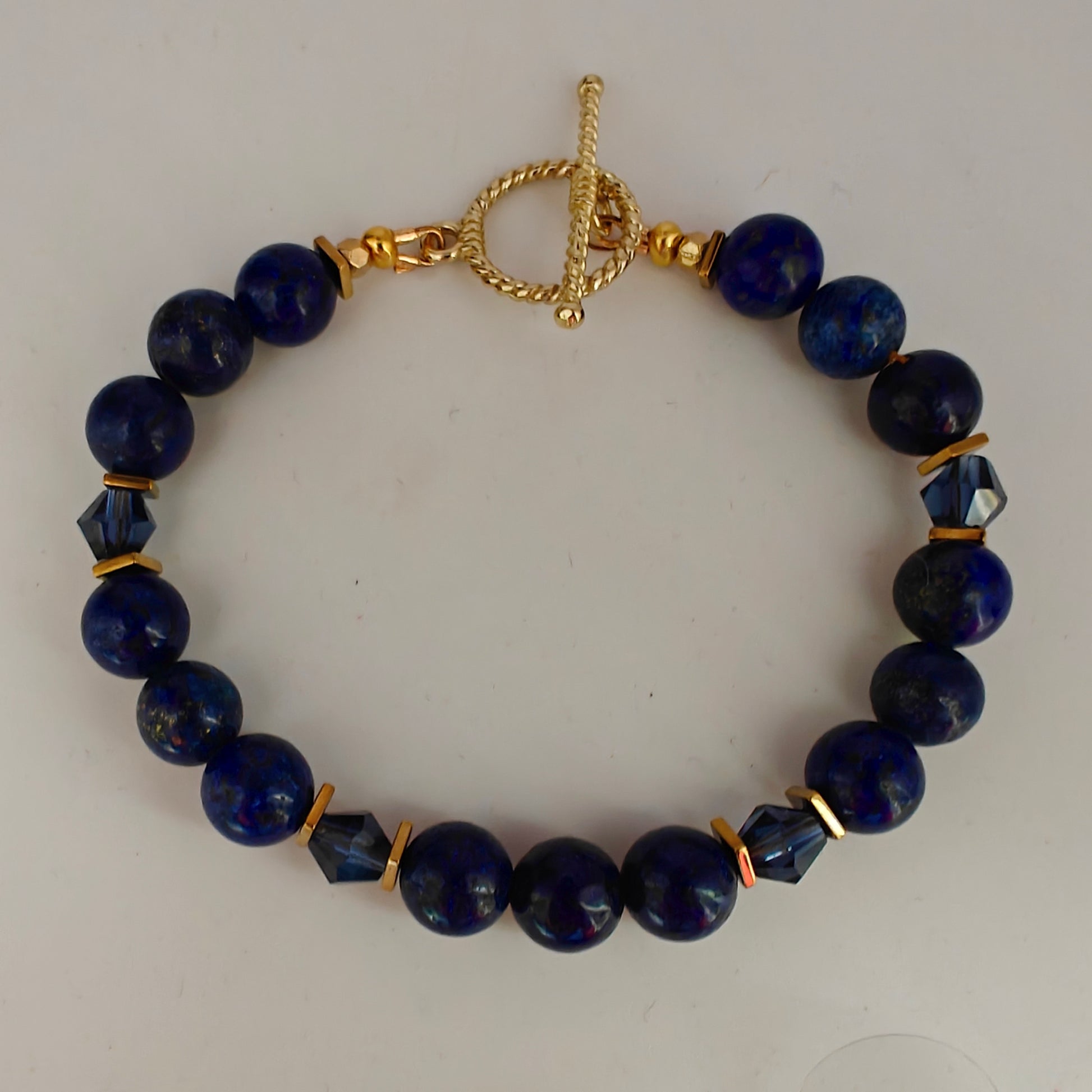 Handmade beaded bracelet features genuine deep blue Lapis Lazuli beads (10mm), Montana Blue bicone beads (8mm), and antique silver or gold accents with a toggle clasp.