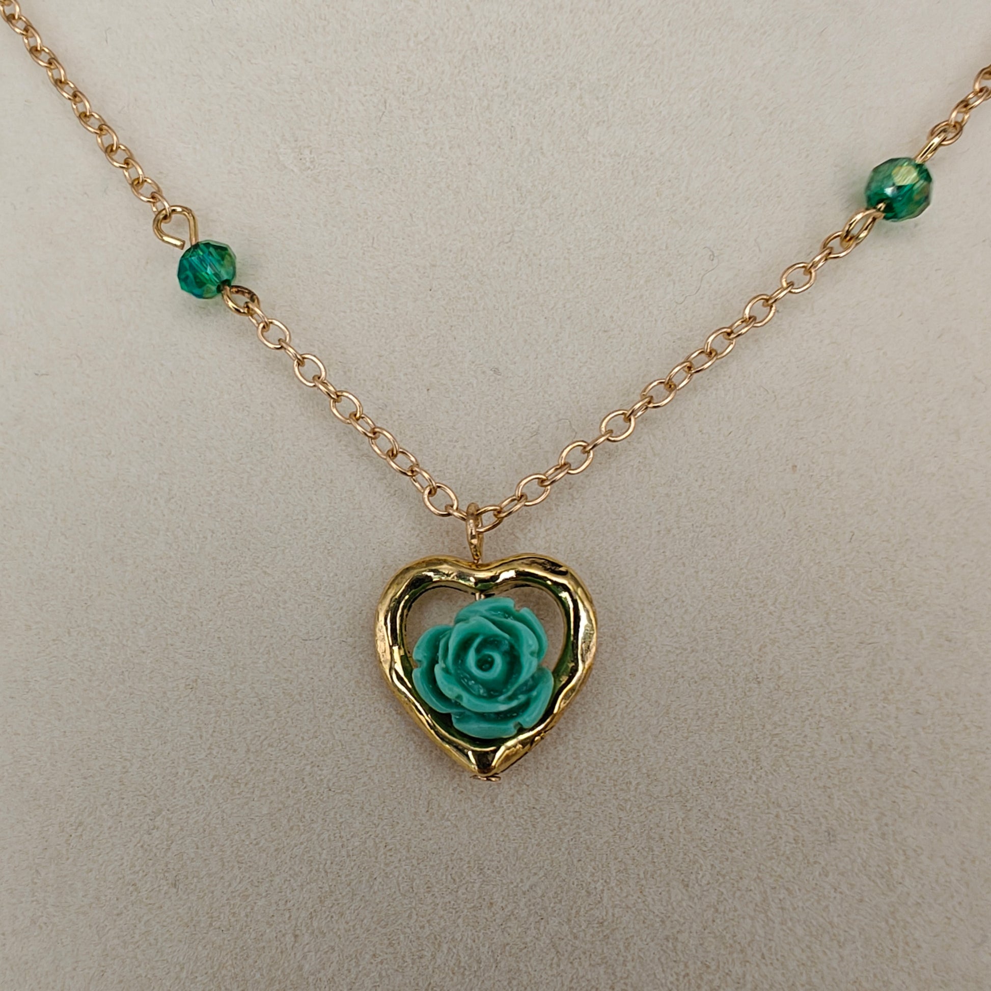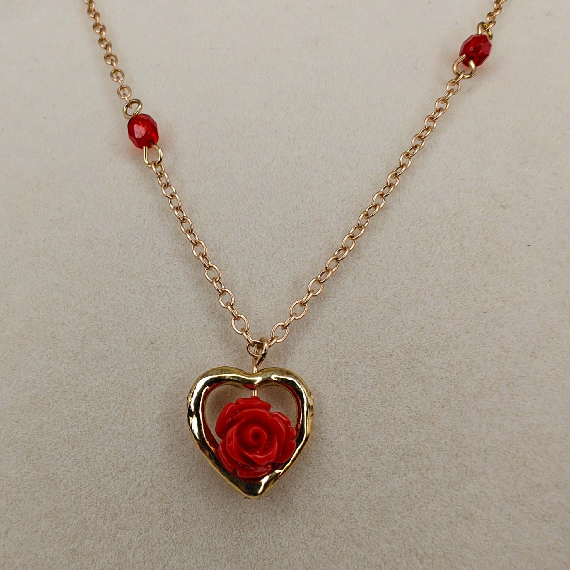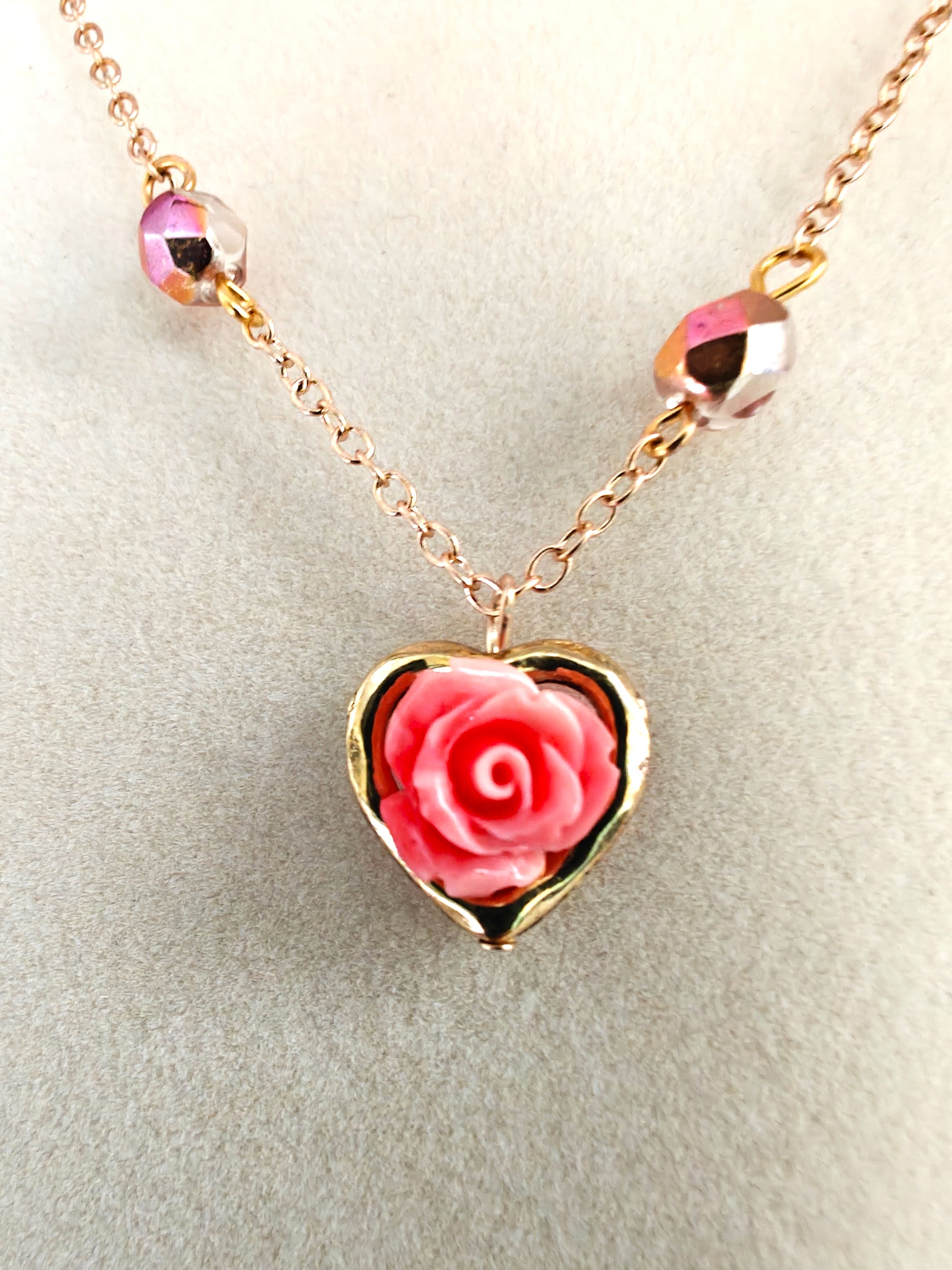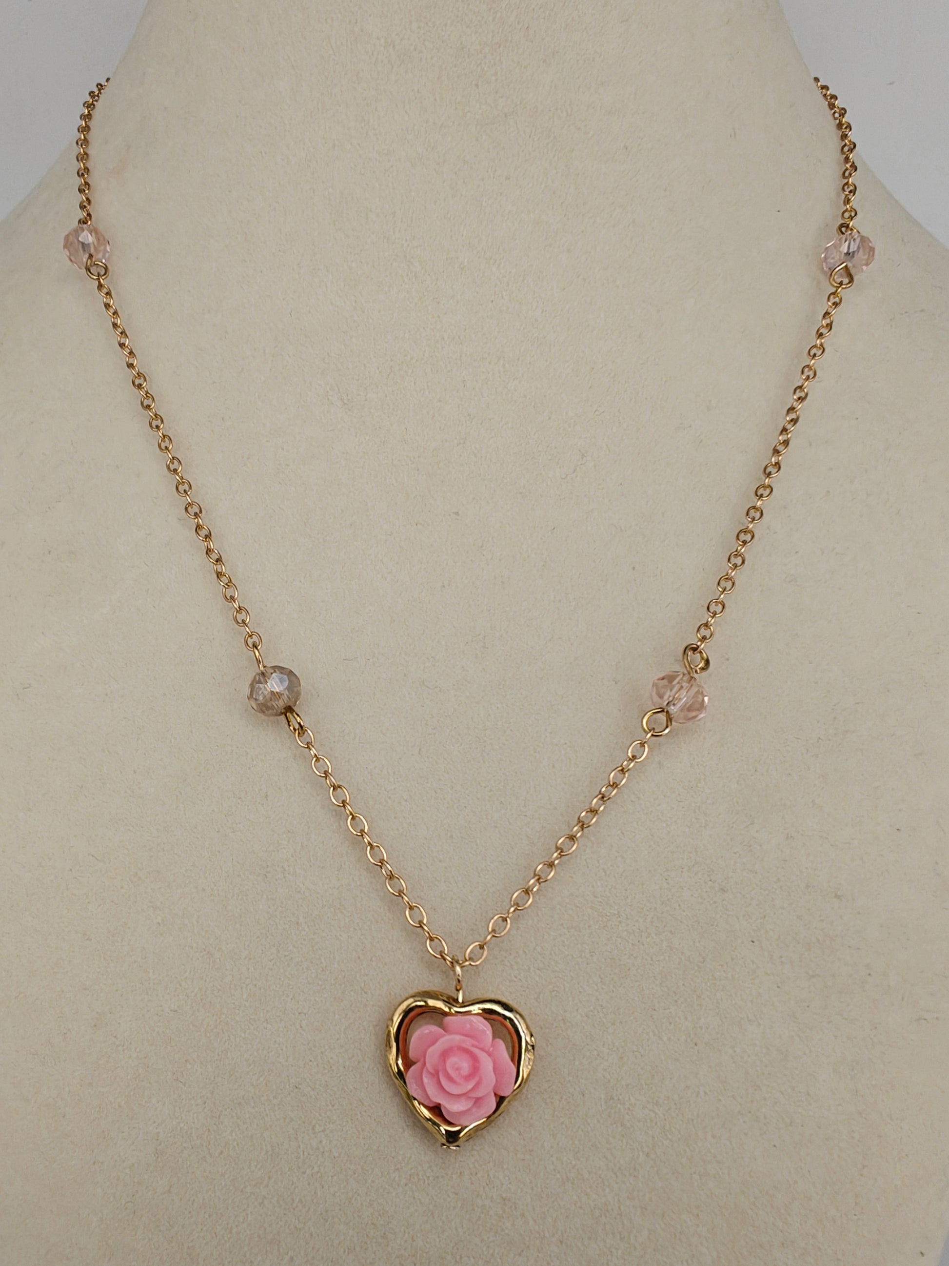 Cute necklace in a gold-tone nickel-free metal with a small rose flower surrounded by a gold heart-shaped frame, and a matching beaded chain.