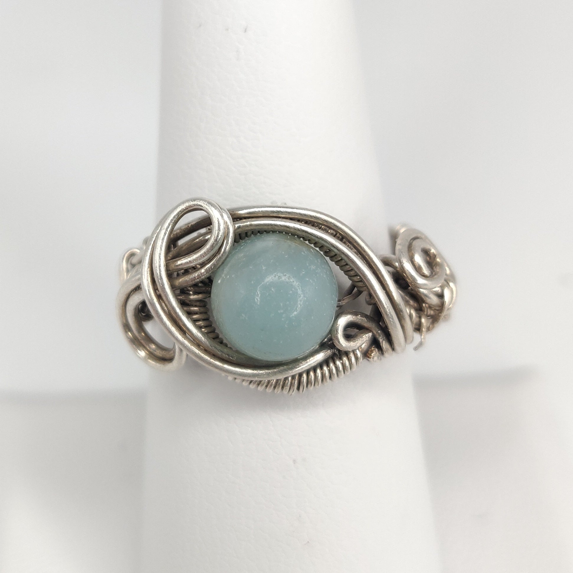 One of a kind, handmade ring with a genuine Amazonite bead (6mm) wrapped in antiqued Sterling Silver filled wire.