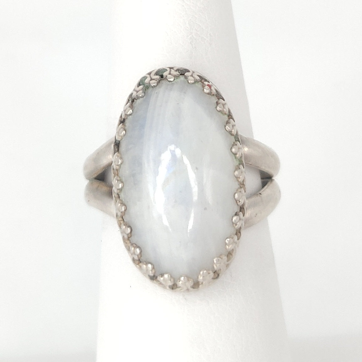 Beautiful Rainbow Moonstone Cocktail Ring made with antiqued .925 Sterling Silver. This cocktail ring features a genuine oval-shaped Rainbow Moonstone cabochon set in a vintage inspired decorative bezel setting with a split shank double ring band.